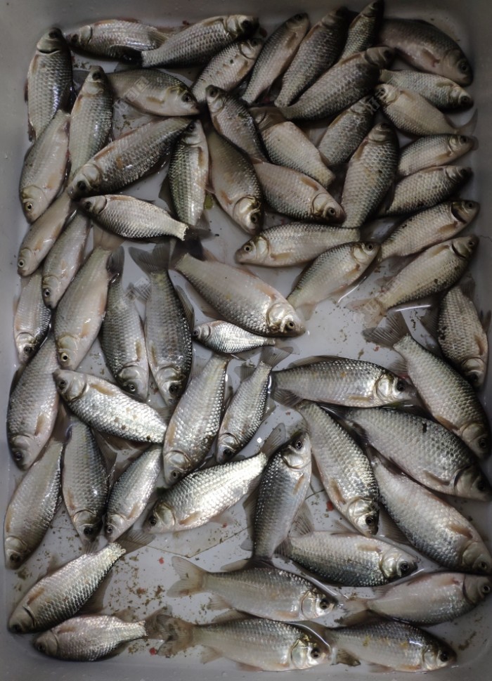 到钓点时人还没去几个,我还是选择了老钓位,冬天还是不要轻易换位置,老钓点可能会有很多鱼知道这里有吃的,长期聚集在附近。开的饵料腥饵和香饵各占一半,这个温度我还是不建议太腥,上次我多加腥就引来很多小杂鱼,等再降温估计腥饵就好用了。饵料开好后要放到旁边多醒一会,天冷出丝慢,这里我建议拉丝粉多加一点,不然不像夏天出丝那么好,冬天拉饵对于钓小鲫鱼来说效果会好很多,拉的不好影响鱼获。在醒饵的时间可以准备鱼竿和线,这样可以节省时间。线组还是0.8+0.4的,漂选择吃铅1.0的芦苇漂。