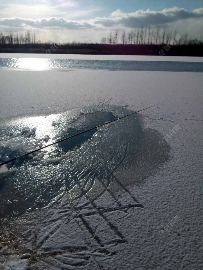 寒暄几句,看看在哪里可以做钓,俩人一商量现在河边化开的钓点钓钓看,走水很严重,我打下俩筏竿,斜着打,因为就是在靠岸的这一边化开了能有六七米吧大约,弟弟手杆做钓,一直都没有口!?后来俩人去了下游一个回水湾,那里冰没有化开,弟弟砸了个冰洞做钓,我呢?我就在有点明水的地方打下俩筏竿,水很浅,估计没有希望,抛下杆就去了弟弟那边看一看?