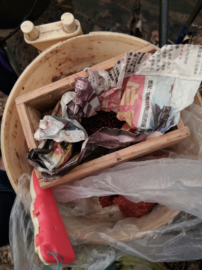 看看这大洞小洞的全是窟窿还咋用呀,????辛好带着一个装饵料的桶,拿来一用,里面还有一些玉米粒,这可是老鼠过冬备的冬粮啊,被你搅和了。