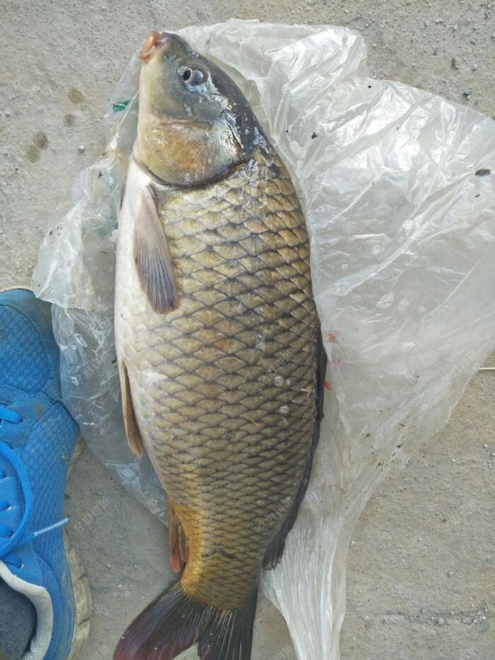 过程不表,开饵,打窝,坐等鱼开口。这一等就是3个多小时,窝里有鱼星,就是不开口,大家都一样,整个河岸基本没口啊。看来天气忽然升温鱼不适应。中间看到窝里有大的鲤鱼星,就顺手把抄网支上了。(事后感觉自己太英明了?)中间上了两条鳊鱼,但是一出水就脱钩。总算有口吧,还脱钩,郁闷死了。差不多3点钟,肚子饿了,也不上鱼,准备回家了。拉饵抛竿,把杆子放到架杆上,去后面撒泡尿,回来提杆准备收杆回家……感觉挂底了,不对,有鱼,哈哈,有大鱼。隔壁的大哥喊中大鱼了,一下围过来十几个钓友。好紧张,0.8的主线,0.4的子线,2好袖勾。遛了十几分钟先出水的是大红尾巴。大鲤鱼,原来是钩子挂住鱼的尾鳍上了。人多也没有拍大弯弓,也没好意思拍照。最后在钓友的帮助下成功上岸感觉太幸运了。