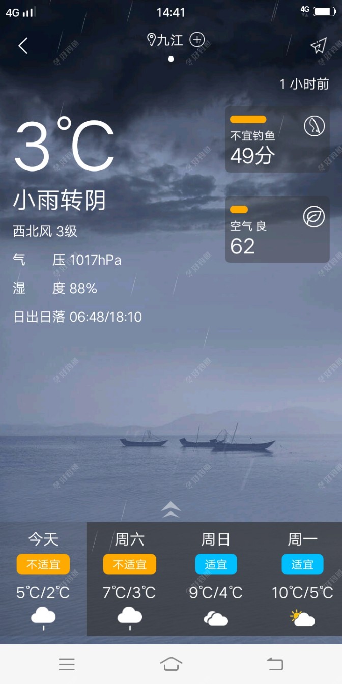 天天下雨,温度也低,每天基本都是睡在床上玩手机,看电视,偶尔上app看下各位大师发的帖子.要问我为什么只是偶尔看一呢!有"毒″为啥叫有毒呢,天天看他们发鱼获,这里爆护,那里狂口的!搞得我都不敢看,我这天天下雨想出去也出去不了! 早上还在被窝里,被夫人喊起来吃早饭,吃完饭坐下来抽根烟,貌似今天外面没下雨?