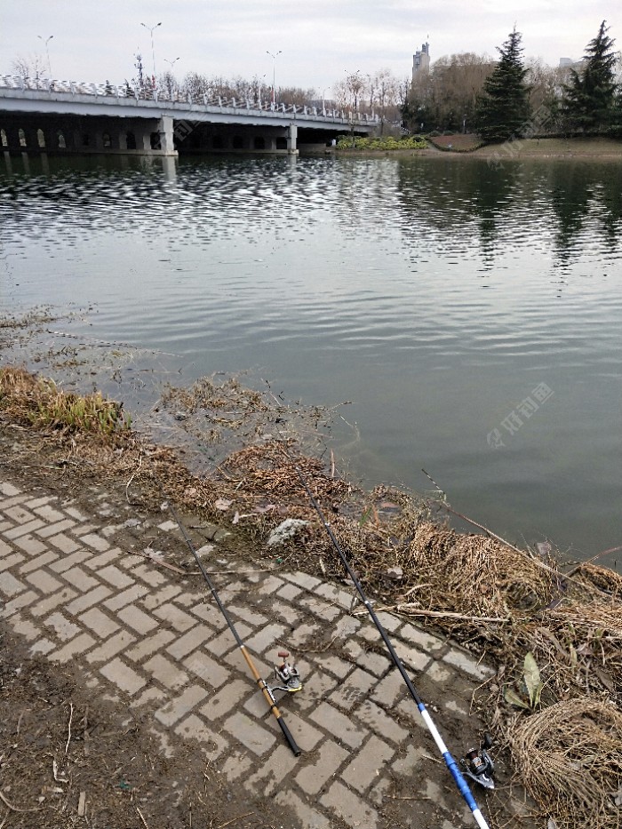 两竿都抛完,眼睛一刻不离竿稍,生怕漏过任何一个鱼迅。可是等了大约十分钟,两竿稍纹丝不动。于是我就把先抛的那个竿子慢慢摇轮收线逗钓,线收完了,再次抛向另外一个方向去找鱼,就这样,两个竿子轮流逗钓,面前水域扇形范围内都试钓,没有一口,看来这个地方的鱼都走亲戚了,无鱼可钓了。赶紧收竿换地方。延着河边向下游发展大道桥走去。