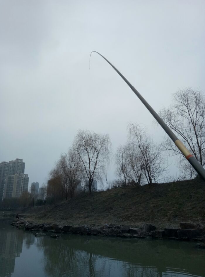 为什么又上一张弯弓图呢,因为为了显摆我又跑鱼了。一个缓慢的黑漂上了个鲤鱼,斤把重的样子,第一时间拿出手机准备拍照发朋友圈。结果无倒刺的2号在它的一个挣扎后脱钩了,十分的不给面子。。