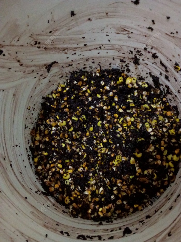 玉米已经煮好了。做窝料的玉米无所谓的,直接跟酒渣渣一块拌匀。因为打算泡上很久,所以加了些干的老玉米。这种窝料不同于别的老酵玉米整袋整袋往里扔。而是每次打其他窝料时往里掺一两把即可。