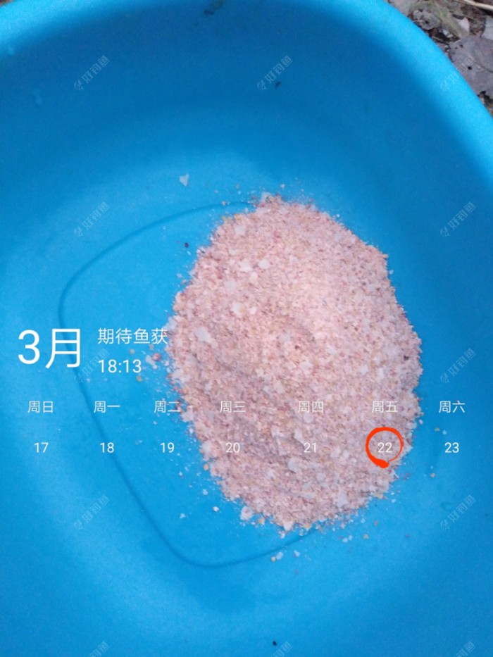 放下装备就开始组装钓竿线组,抽空把仅剩的一点酒米抛了下去,上次做的四斤窝料已经全部用完,效果那真的好的没话说,这两天还要再多做点? 今天准备用江湖猎人腥香鲫做饵料,不知道这个温度下使用效果如何啊,有点期待。 老规矩,还是单开,不添加其它任何辅料了。本着开多少用多少的原则,取料大约三十克,按1:1的饵水比搅拌、静置、打揉、搓团。