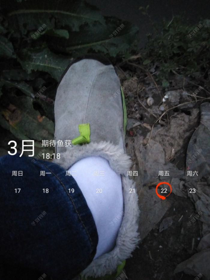 由于是临时出来夜钓的,所以今天并没有约伴同行,自己一个人那就要处处多当心咯。除了衣服裤子多穿了不少之外,连大冷天的绒毛保暖鞋都穿出来了,夜里估计挺冷的。