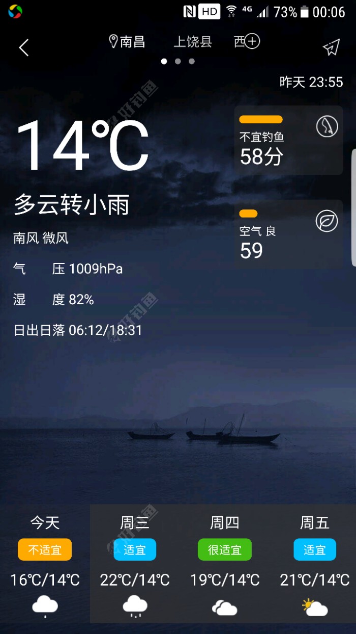 今天预报说中雨,早上就开始下个不停,中午吃完饭,雨开始小了,明天端午节了又是下雨天,没生意,跟领导说了一下,我去看钓鱼了,到了钓点,一个老铁在钓,打开平台预报看看,气压998 没风没浪,气温24至28...