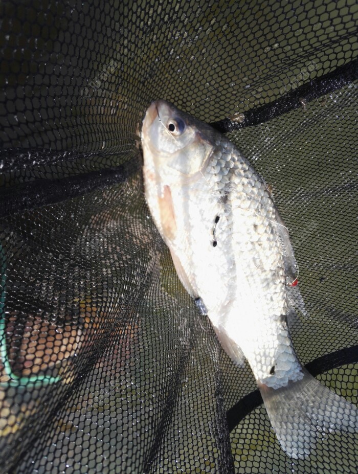 看好地方我俩下到河边刚好俩钓位,钓友首先坐到左边说右边钓位太深了,没有别的可坐,既来之则安之,坐下后找底发现左面有一高地比右边浅半米,支竿打窝和饵,今天用老三样:篮鲫二份化六二份澡元素一份,加尺上一点五份减轻饵重好入口,上钩拉饵下钩虫饵下去就是一个漂亮的小顿口。