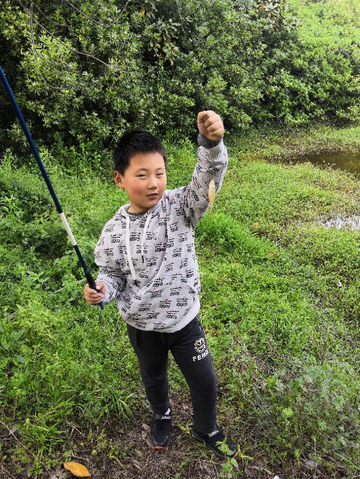 就是小啊,还有一个小钓手,就是我儿子,也是在好好培养的,呵呵,不一会,看到儿子鱼竿的浮漂也送上来了,我赶快喊他抬竿,也是一条比我,少大点的鲫鱼。下面是他开心的照片