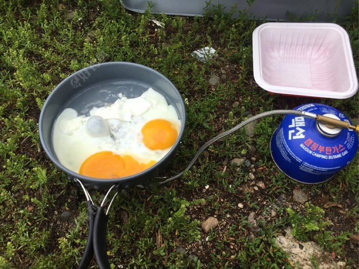 齐全吧,来看看我们的早餐(由于温度有点低,所以火力不足,蛋煎的不太美丽)。