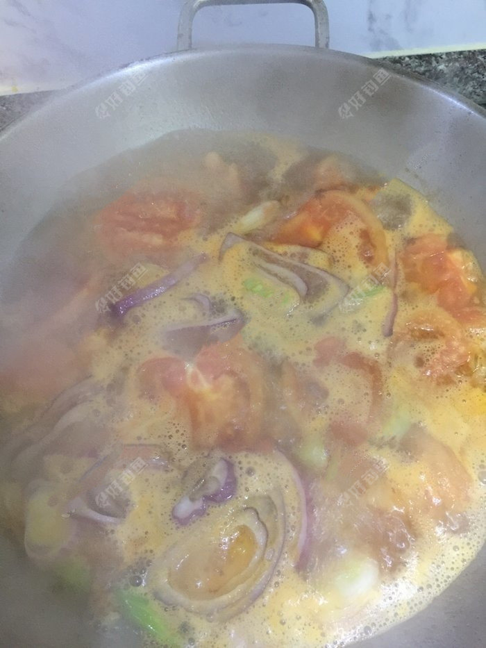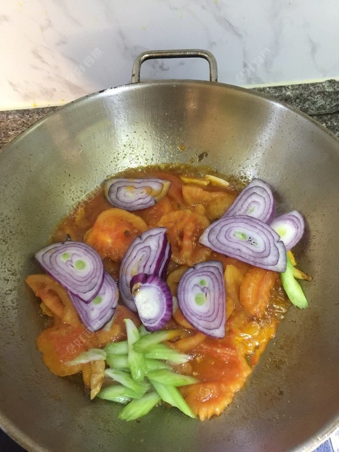 等到西红柿出汁后,就加入洋葱圈和芹菜
