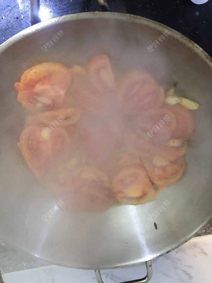 同样的再下一点油,加几片姜和蒜,开始炒西红柿