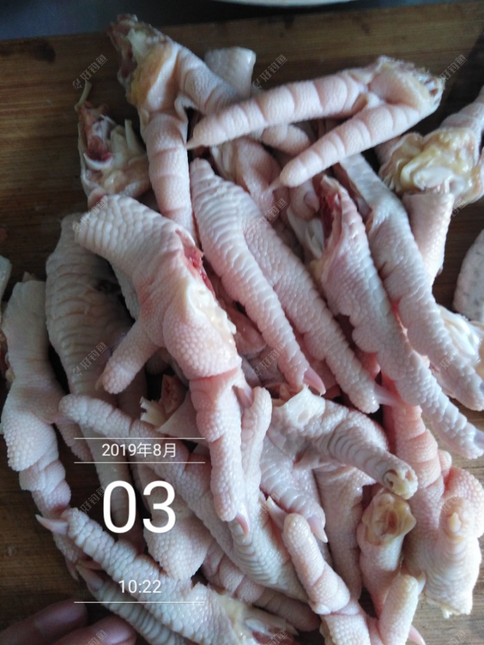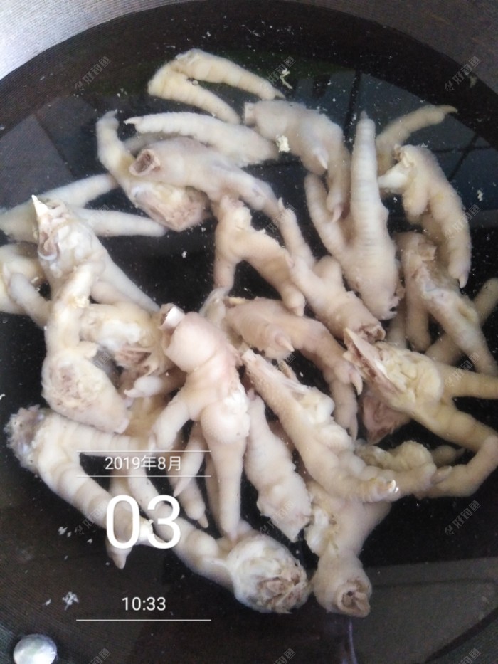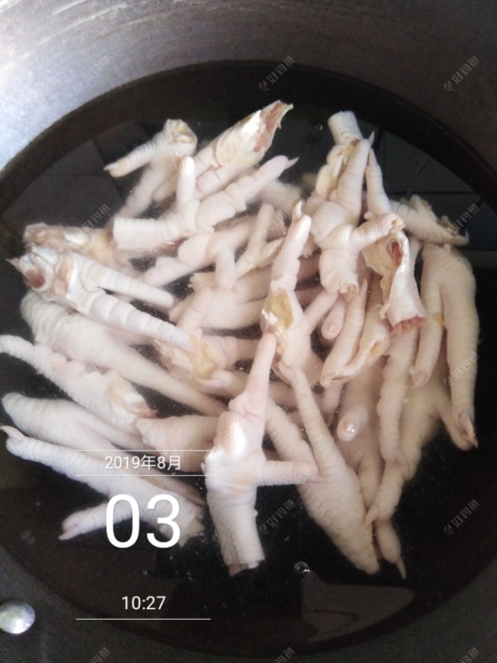鸡爪用冷水煮开,然后取出用凉水冲洗一下