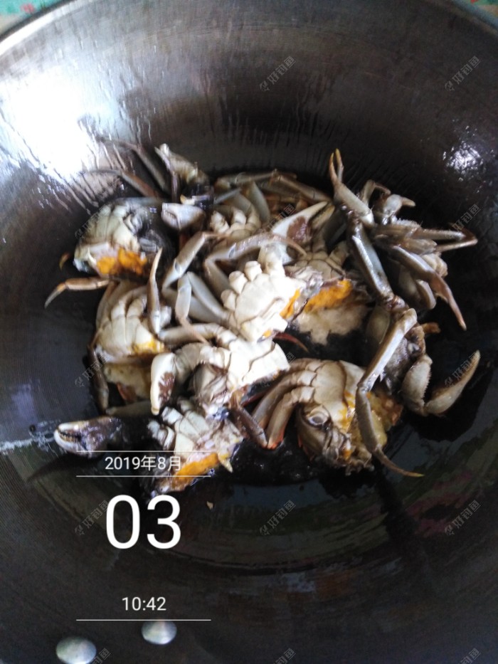 第三个是爆炒六月黄 主材料是螃蟹,辅料是胡葱