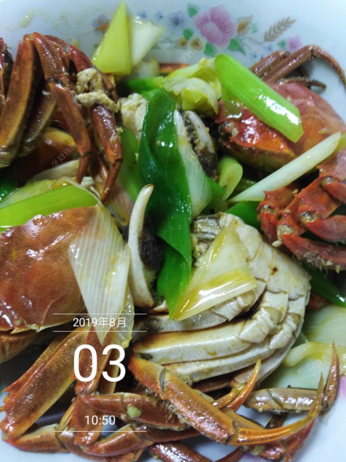 蟹壳变色之后喷入料酒,翻炒后加入大葱,食盐,糖,大火收汁即可