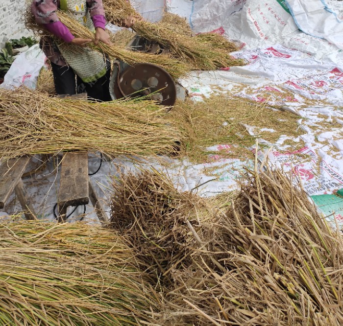火急火燎的回家,看看我的鱼竿,两杆子上的红虫都光了,心中一喜,有口就好。换蚯蚓吧。耐泡些。 端着老妈煮好的早饭,我就蹲桥上吃,看咱多敬业。。。。早饭吃完还是没口。(吃的快,稀饭一大碗五分钟。) 有正事呢,该忙忙吧。老妈长的糯稻,不多,收割机派不上用处。自己动手吧。