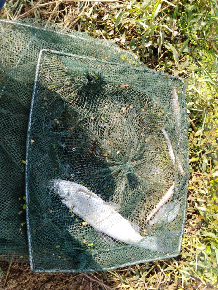 浮漂调五目钓三目,架了两根竿子,均是5.4米鱼竿,一根挂蚯蚓,一根拉饵,先用酒米打窝。 打窝后开始作钓,挂蚯蚓竿子一上午中了三条沙丁,鲫鱼没有鱼口。 拉饵先是钓底,拉了一上午,并无明显鱼口。 中午简单吃了一口饭,喝点茶水,调整浮漂,准备钓浮试试看。 大概2点钟左右,浮漂突然微动,慢慢黑漂,提竿中鱼,此鱼左冲又突,甚是有劲,不断往下拉,不敢硬拉,慢慢遛一会,抄鱼入护。