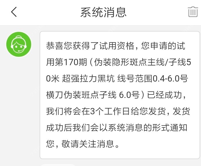 今天和往常一样打开平台,看到了平台发来的消息原来是我已经获得了申请试用的资格,申请试用的是斑点隐形子线2.0 很快9号收到了鱼线。
