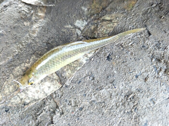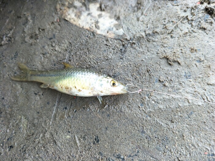 不说了,开饵,饵料盘没有,将就口袋活饵,老三样,比率大概各占一份,饵水比1:0.9 本来还是想钓点鲫鱼,撒了两把米,最先钓底一直没口,饵料也没口,又悬了,看到小鱼跳水干脆就钓浮,拉拉白条算了