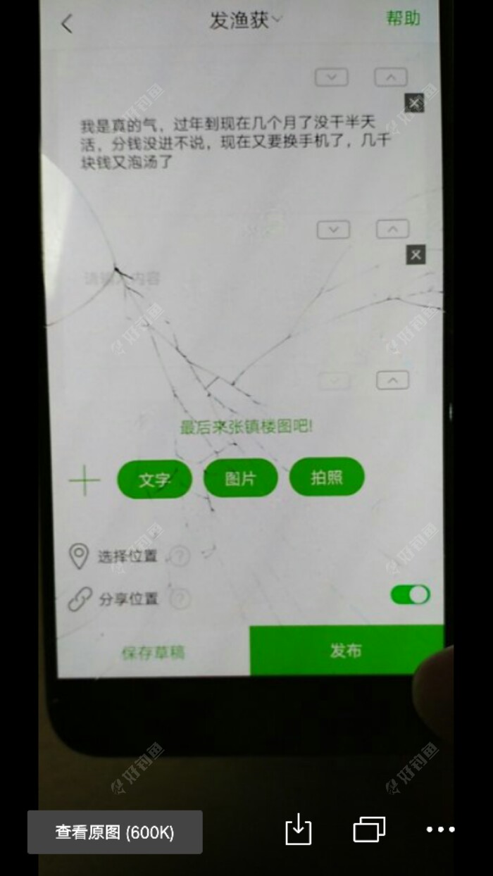 线组钩型都合适,主要是脱钩取鱼费时,一条一条摘,又满手整些黏液,钓一条鱼洗一下手,又在裤子上开,裤子又整烦了。真的费时啊,频率都打不起来,好像上鱼最快的时候也不过连着上了四条 改天是要看买个挡针还是自制一个了 最气人的不是晒一下午的太阳,又不是因为只钓到几个鱼。是收竿回来的时候,手机摔坏了 乡下那种水泥路比较窄,上坡的时候后面来车了,绊斗石头了,手机没拿稳,啪的一声摔地上 我是真的气,过年到现在几个月了没干半天活,分钱没进不说,现在又要换手机了,几千块钱又泡汤了