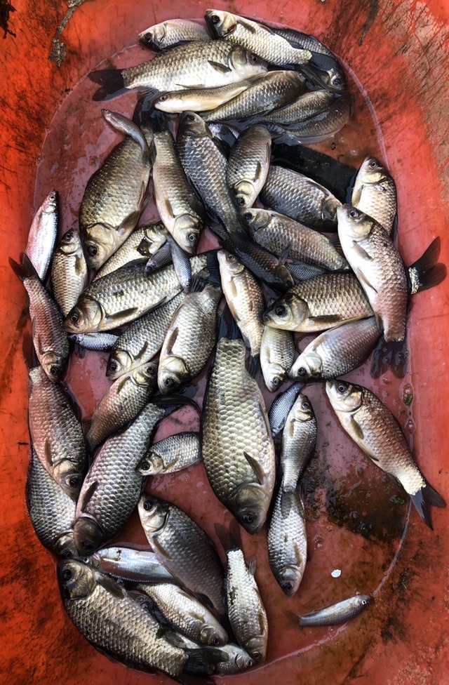 既来之则安之,没想到4,5点开始频繁上鱼,个头也都不小,一般湖里才有的板鲫也上来了。哈哈,看来倒春寒对鱼儿胃口影响不大。最后钓上来差不多40多尾鱼,放回去20多条小嫩鲫鱼,留下10来条大鲫鱼和猫鱼,愉快结束垂钓周末。