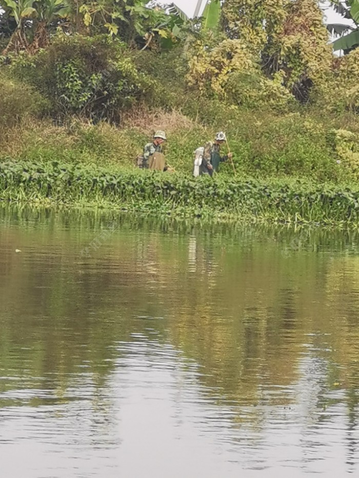 远远又来了一只机动小铁船向我们开来,船中有二人,船头一人说要到我这边来,撑船人说:人家在那里钓鱼就不要过去了!心里默默给他一个赞!向对岸去了,以为是网工,只见他们停船下来两套装备上身,原来是电工!