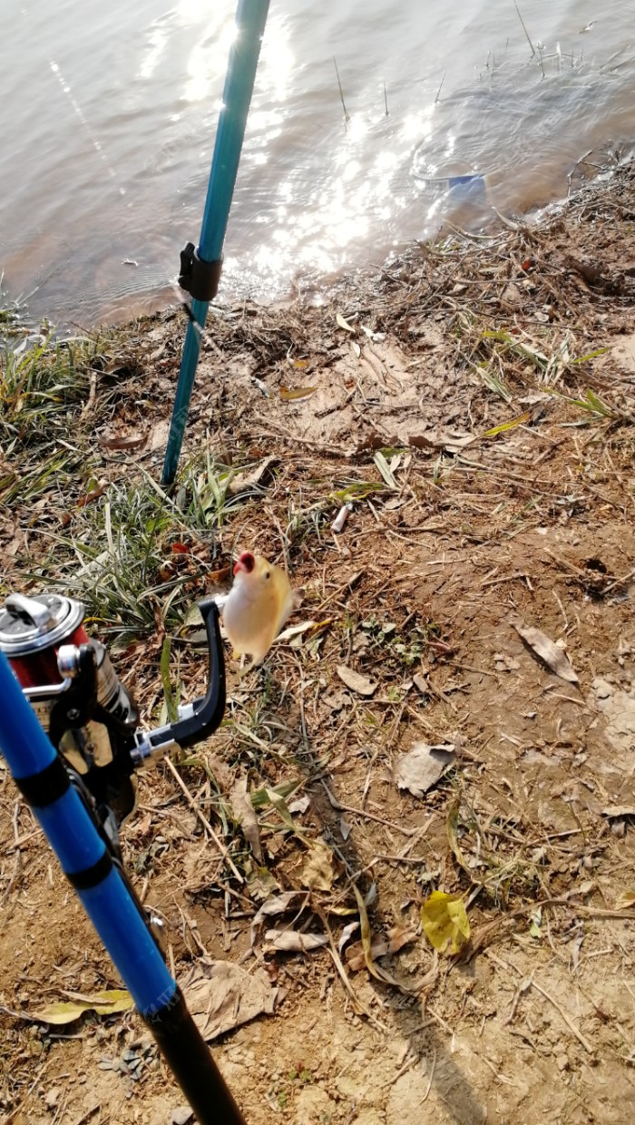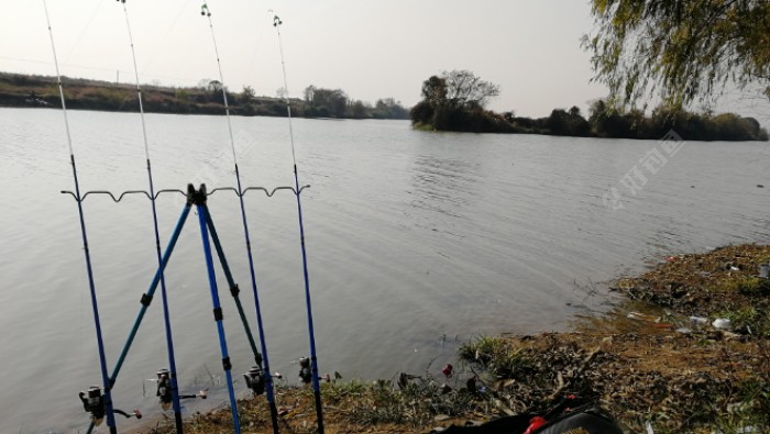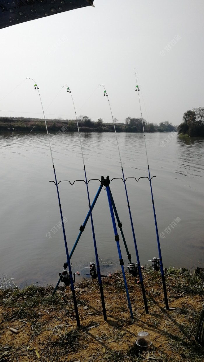 今天用2.1米的岸筏竿,串钩线组2.5+2.8+1.0,5号的金海夕,30克的铅坠,一个串钩上3把钩子,今天的太阳比较大,岸筏的优势显示不出来,要是天冷,鱼都在河中间水深的地方趴着,太阳大了,鱼就到浅处活动,所以今天岸筏也不打算打的太远,离岸十几米就差不多了,4根杆子都下水,夹上铃铛,拿出手机,拍几张照片发给老友,谁叫他没来,馋馋他。