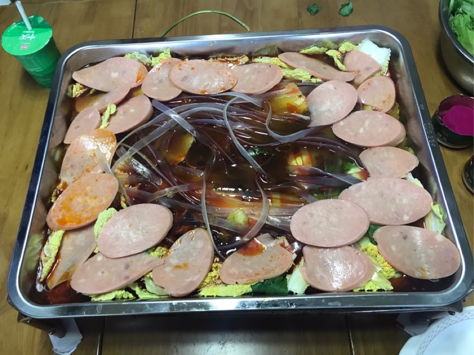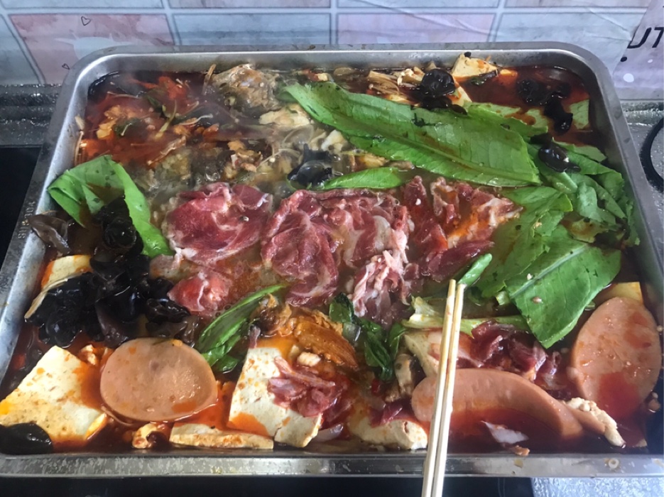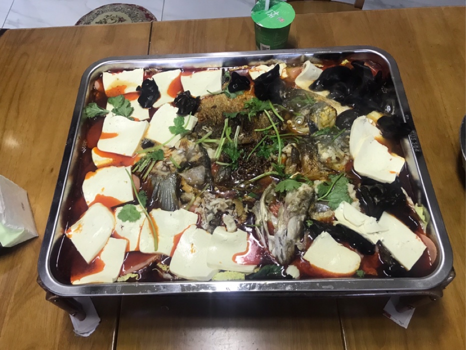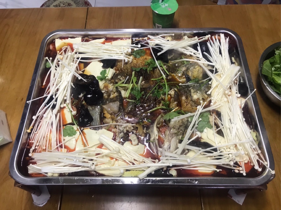 刚开始准备时忘了拍照了,准备差不多了才想起来。其实我的做法很简单,家里人还挺爱吃的。尤其媳妇,强烈要求做一顿,而且要多放辣椒。下面介绍一下步骤。首先,鱼是卖鱼人帮忙收拾的,我只是清洗了一下血水,侧面改刀,然后用盐和葱姜料酒味一下。味鱼时取一小块四川火锅底料炒一下,我又往里面加了些辣椒。炒好料加水烧开调味,然后倒进准备好的方盘里备用。接着准备配菜,香肠、金针菇、油麦菜、娃娃菜、豆腐、粉条、木耳等等。总之你喜欢吃什么就放什么。顺序是,青菜垫底,然后放粉条,上面铺上香肠或者午餐肉罐头,再上面是豆腐片成薄片方便入味,四周摆上金针菇和木耳,配菜齐活。然后起锅烧油,油温七成下鱼煎至两面金黄,摆到配菜上,点缀些香菜即可。