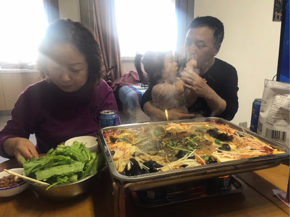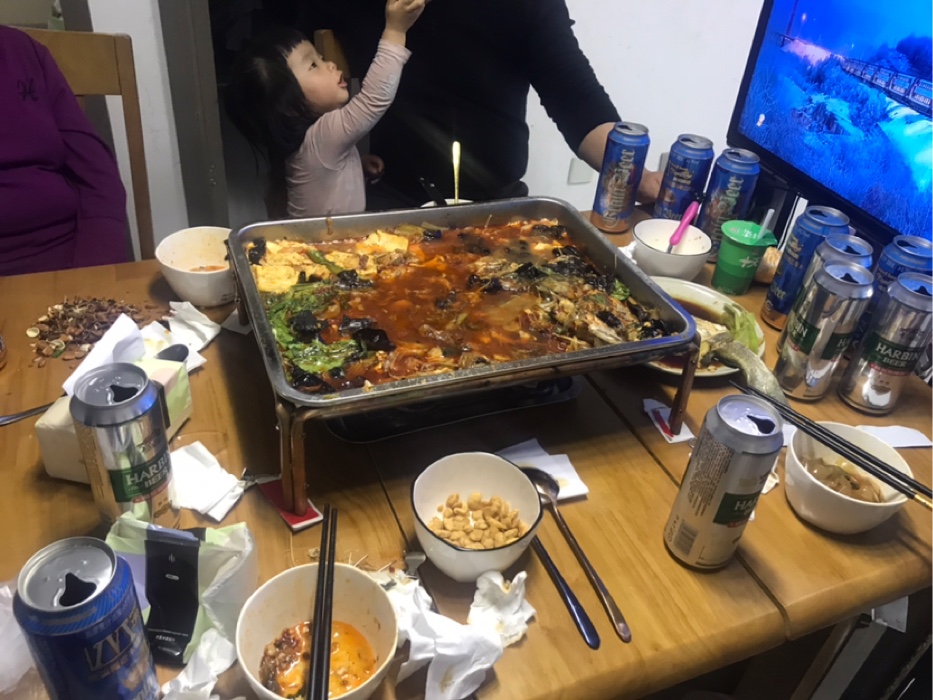 准备就绪后,一家老小也从外面回来了。清蒸鲈鱼交给老爸做。我冰了一箱啤酒,拿出一些干果,点燃酒精块。上气8分钟,鲈鱼就蒸好了,烤鱼也正好开锅。一家人上桌开搂!
