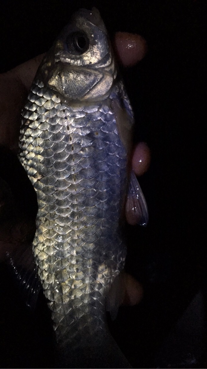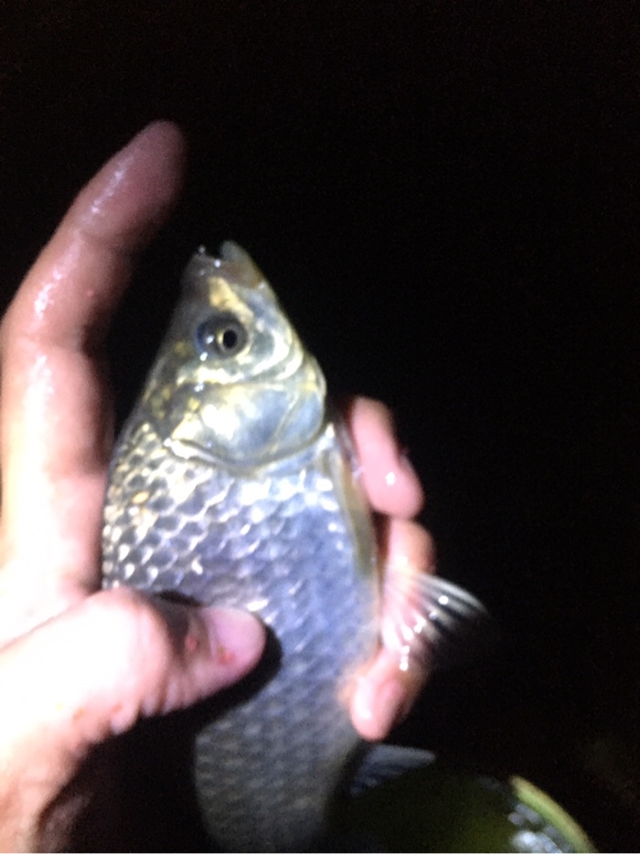 饵料状态非常好,饱满细腻柔软,雾化效果好,付钩性强。诱鱼快。开始搓的饵稍微大一点,作窝子,边诱边钓 10分左右,大约抛了20竿, 浮漂轻轻上顶,提竿,迎来了开竿鱼,是一条二两的鲫鱼。皮毛还不错小鲫鱼。飞上来。抛竿在继续