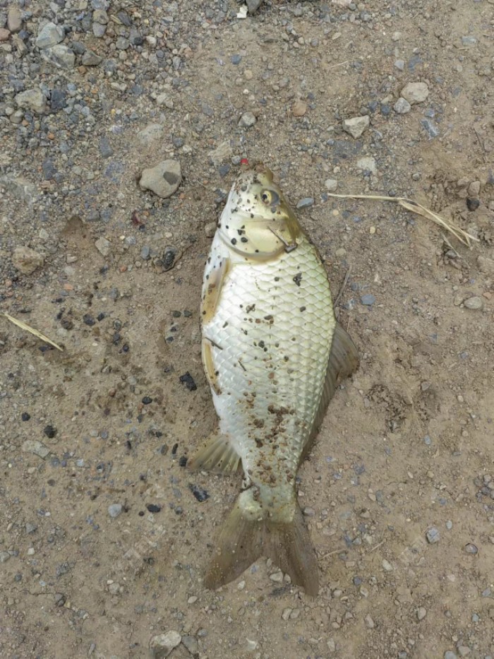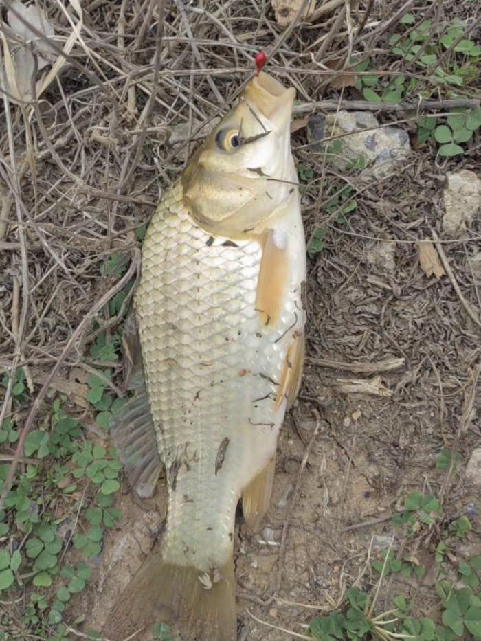 单位新领导也爱钓鱼,上周三告诉我他新认识了一个水库的老板,里面大板鲫很多,约我抽空一起去钓一次鱼,听说有大板鲫,弄得我心里痒痒的。 周六值班,我们约好了吃过午饭就过去。饭后带上另一个同事,三人一起出发,到达的时候已经快12点半了,打了6个窝子3个人共用,和水库老板聊了一会儿天,等待发窝。 1点钟准时开钓,下杆就中大板板一尾,上岸后来了个鲫鱼打挺,沾了一身的泥。