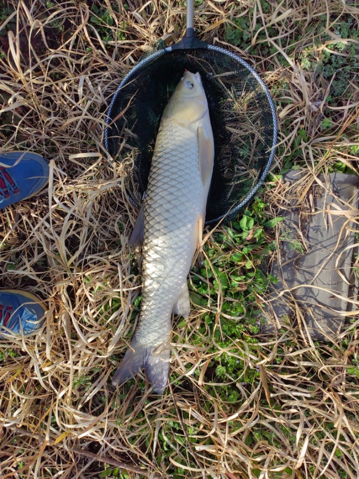 目测体长约70厘米,至少在8斤以上了。 大货上岸,也没心思继续钓了,又钓了几尾杂鱼和鲫鱼就收杆了,中午酸菜鱼可以赶紧准备了。 总结一下: 1.短杆细线小钩,能干上来大货,首先是运气了。 2.竿子是便宜货,偏软,应该有一定的好处。 3.碰到这种明显没有优势的线组,溜鱼时千万不要硬来,用时间来慢慢耗它,剩下的就交给运气吧。 4.动态朝天钩立漂线组测试过好多次了,野钓时适应性很强,水底不平也不影响作钓的灵敏度。 5.春季气温上升快,日夜温差大,这个季节尽量早点作钓,感觉9点以后口就差很多了。 最后,祝钓友们也能大货连连,小钩细线干大物!