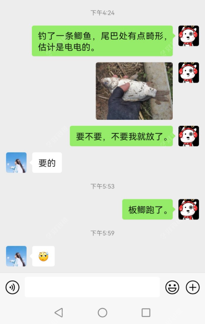 大板鲫一条。 只是尾巴处有点畸形,可能是被电工电过。当时也管不上身上湿漉漉的了,立马拍照向老婆炫耀了一翻,当然,没敢说掉河里的事情。