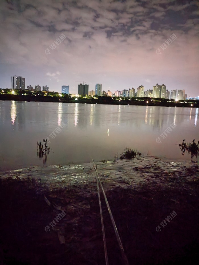 一路静悄悄,偶遇一对小情侣,这么黑的夜这么偏僻的路来江边约会,胆子和我有得一拼?。直接快速通过不打扰来到江边,发现水退了大约1.5米,有三个钓友已在玩了,海杆手杆都有收获,寒暄了几句便往上走了。因为水刚退,泥水未干,鞋子陷进泥潭里不好走啊,只好慢慢摸索借着杂草行走。随便找了个钓位支竿调漂。