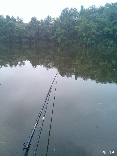 当下午,独自驱车启程,路上车辆很多,还好不太堵,三个小时就回到了老家——自贡。盐都自贡,恐龙、井盐和灯会被称为自贡“大三绝”;龚扇、扎染和剪纸,被称为自贡“小三绝”,素以“千年盐都”、“恐龙之乡”、“南国灯城”、“江姐故里”等美誉而蜚声中外。 自贡的美食更不用说了,俗话说“吃在四川,味在自贡”。对于我们渔友来说,自贡有200多个大小不一的水库,实属野钓的天堂。 10月2日凌晨5点,和峰哥出发了。一路披星戴月,直奔目的地—木桥沟水库。 木桥沟水库位于自贡和宜宾交界处,属于两地共管的饮用水源,库里水产丰富,鲫、鲤、草、鲢鱼,红尾、翘壳都有。 钓鱼不收费,但不能夜钓,不能钓鲢鱼。水库的面积很大,但水面不宽,呈沟状,纵横交错,是一个让渔友又爱又恨的地方。 很多渔友钓两、三天,依然空手而归。对于这种水库,钓位非常关键,打窝、养窝至关重要。 经过40分钟的车程,我们来到了美丽的木桥沟。月亮依然挂在树梢,天空微微泛白,平静的水面倒影着远处的山峦,组成了一幅绝美的山水画卷。 背着行头来到我的老钓位,钓位四周杂草丛生,显然已经很久没人在这钓过鱼了。清除杂草、安装钓具,架竿、调漂,再把“陈药师”的窝料撒上三把,一切就绪,这时,天色渐渐亮了起来。 今天的天气非常不错,鱼口应该很好,满怀希望静静地等待着,但现实往往是残酷的,整整一个上午,漂没动过一下,中午时,又补了点窝料,继续等。不远处,峰哥那边,也是一样没动静。 虽然鱼没开口,但四周风景如画,独享着那份宁静,心情也是十分惬意。 下午4点,终于开口了,一条二两多的红尾上钩了,迟来的爱!