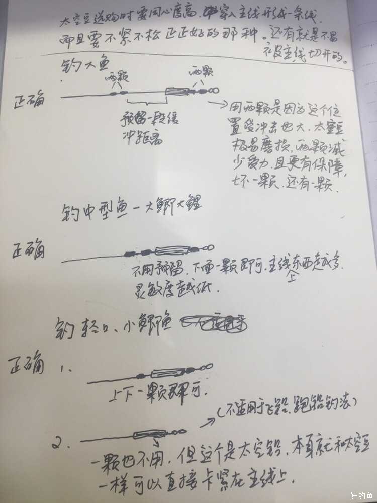 先讲下主线选购技巧 1.主线耐磨性-为什么说主线要选耐磨的呢! 其一、太空豆摩擦问题 (1)调漂时、做钓时,太空豆会经常在主线上来会上下调整,一根主线如果不耐磨,太空豆来回摩擦起热,尼龙线很容易磨损,起毛,所以你看好多主线为啥是有颜色的呢,因为主线里加入了特殊的耐磨涂层。 (2)卡在铅皮座上下的太空豆,靠近8子环那颗暂且不说,重点说上面那颗,为啥上面有时候非要用两颗太空豆固定呢?相信有许多钓有不明白!一颗不就能固定了,为啥非要用两颗?原因的这在钓大鱼的时候很必要,有时大鱼的冲击力十足,很容易把铅皮座上面那颗豆冲散导致打开,这打开时瞬间的,是快速在主线上的移动摩擦!这一下的快速摩擦对主线伤害很大,极易造成断线跑鱼!所以主线一定要耐磨,上面要用两颗豆固定,让铅皮冲击不至于导致太空豆打开。下面画图说下正确做法。(见图示)
