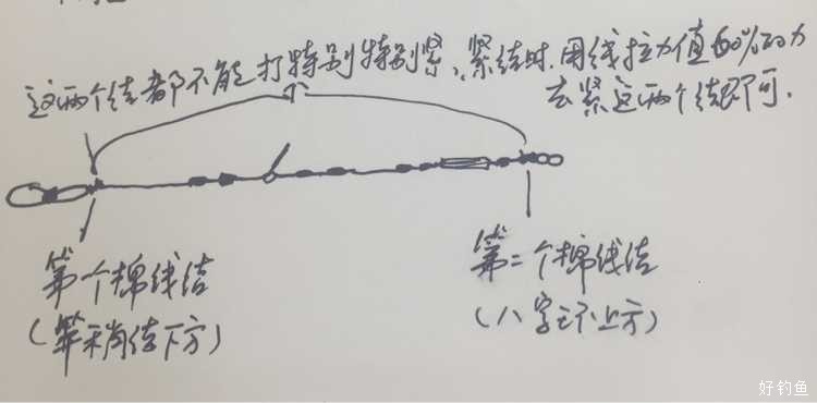 绑制方法竿稍第一个棉线结参考视频“钓鱼公开课第2集”的绑制方法,只是在绑制的时候顺着主线多加了一根缝衣服用的棉线而已。而八字环上的棉线结绑法(参考下图),也就是正常绑法加根棉线而已