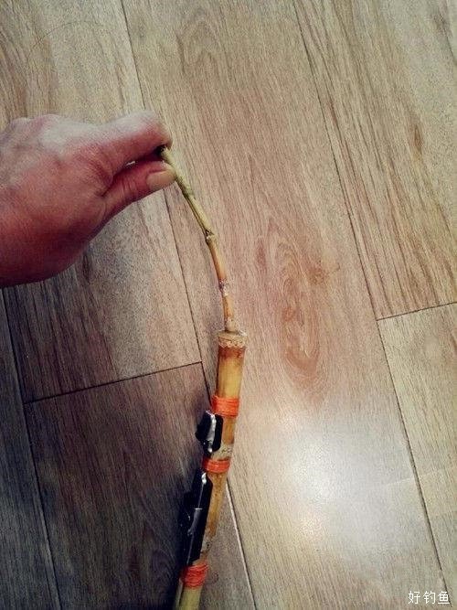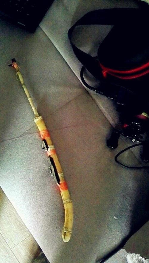 来试一试效果吧,竿稍弯的很厉害,感觉随时都有断的可能,这样就会对野钓带来不利。其实,我前面省略了比较费事的一些环节。为了增加竿稍的腰力,将其通节打通,然后插上一根玉米棒作为内芯,考虑过用不锈钢丝和木棍,最后选择用竹子削成小棍,力量有所增强。 第二个比较费事的环节是在手把上钻孔插上竿子的前半截,要想接口处完全吻合是很难的,只能一点一点慢慢来。心急吃不了热豆腐,我又是个急性子,经常吃鱼没摘完刺就下咽,这不,上周未钓鲫鱼后红烧的菜,现在还有鱼刺在喉咙。竹杆没有干透是不适合动刀的,原来钻的孔现在松了一大圈。第三个比较费事的环节是竿稍内径,要找到内径2.6mm的材料不容易,我还是选择了用细点的竹杆,这样整竿材料都是竹制的。前面说了这么多,最后的结果是:不满意,重来。