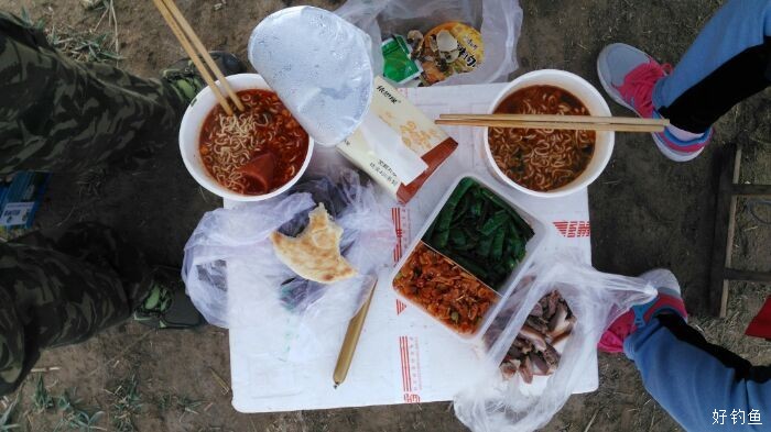 不一会儿崔哥和钓友的到来顿时使这个小鱼塘热闹起来,爱人去当地纯朴的村民大爷家里要了一壶热水,人家听说要吃泡面,特意烧了一壶。暖暖的都是爱?谢谢您,大爷~ 我们的早餐,丰盛吧?