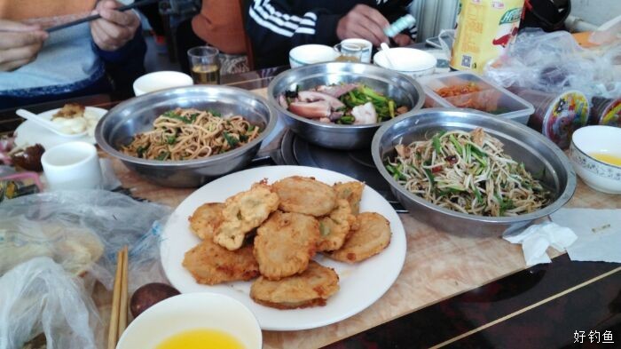 老妈给准备了丰盛的野餐事物,烙的油饼、锅贴,准备了各种小吃和下酒小菜~