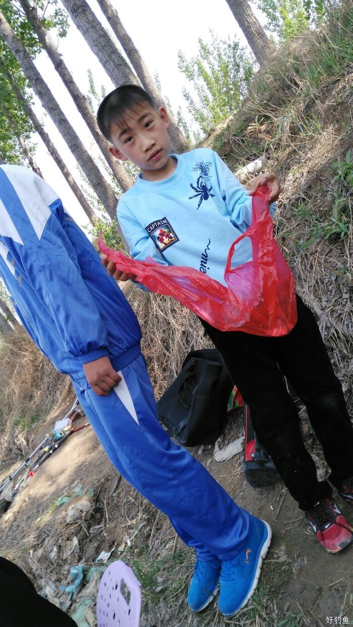 这个小朋友也在钓鱼,但是大家都把鱼获(小白条)送给他,不一会,就搞了一袋子~