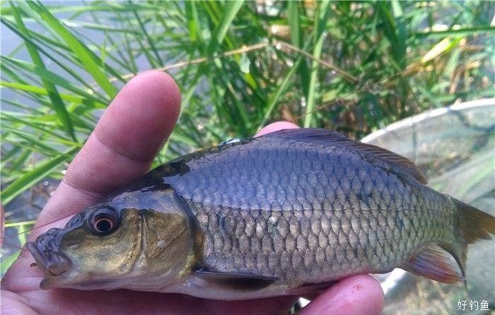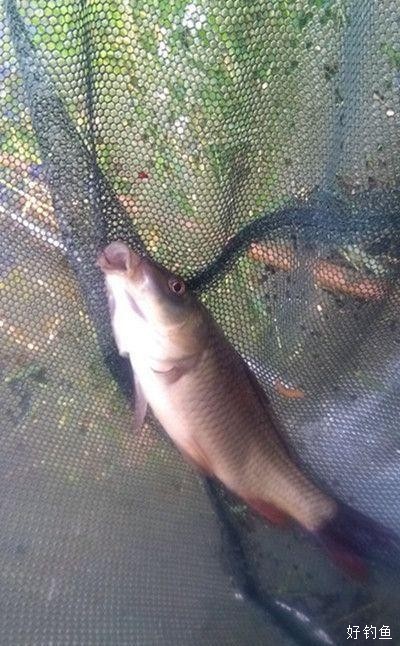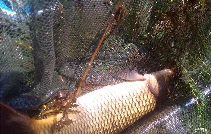 12点40,浮漂出现典型的下沉信号,刺鱼,有点力道。3.6小轻竿大弯弓,两个回合,就和4.5缠线,后来又挂到了水草,鱼没力气后,慢慢拖到近岸,有幸抄网刚刚可以够到水草下的鱼,换了伊豆4号钩 感觉还是心里没底,有幸另一只钩钩在鱼鳍上