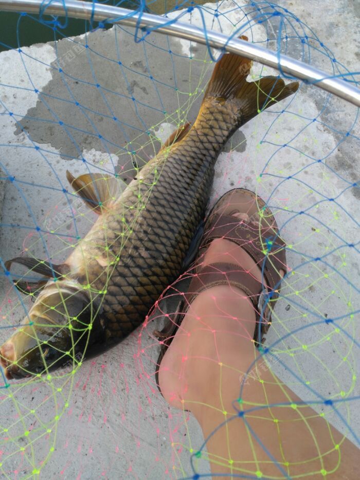 来到板桥猕猴桃园,阿姨说这塘鱼没有饲喂过,水是泉水,水深4米至5米多,鱼品质好,是供应本园餐厅和垂钓的。大小不一,有10多斤的,也有小鱼。(呵呵,不怎么相信) 用6.3手竿,1.5通线单钩,钓底,随便钓,打发时间。调了一袋螺鲤1号,浓香的,1:1水比,发透,用手攥几下,刚好能攥成团,因为有颗粒,下水很快就散了,有散炮效果。抽竿打窝,10秒一竿,抽了10多竿,再把饵反复搓,搓粘,开始钓鱼。 还是小鱼多,浮漂一目的上顶下顿,乱漂。没有什么好的办法,把饵搓大点,让它吃,就等黑漂。说黑就黑,扬竿中鱼,居然是草鱼,差不多2斤,有点意外,继续。 惊喜!浮漂有力下顿,迅速扬竿,不动2秒,不敢加力,突然向右窜,竿顺势而为,继续右窜,边上是网箱了,顿住,想往左领,领不动,因吃痛,居然往下扎了,竿尖下水了,心惊了,别断竿啊!还好,可能是到底了,它松劲了,慢慢提起来了,顺势往左领,过来了,领了不到一米远,向池中走了,要拔河吗,稍松点劲,再扬竿,回来了,继续往左领,慢慢扬竿,不起来,鱼往左开窜,不敢硬来,由它走,来回两趟,扬竿,好,顶起来了,还是没看到鱼,保持住,拿出手机,自拍,刚拍不长,又发力了,扔下手机,继续遛鱼,你来我往,总算可以抄了,看,这颜色,这体型,这个头,郁闷的心情一扫而空。