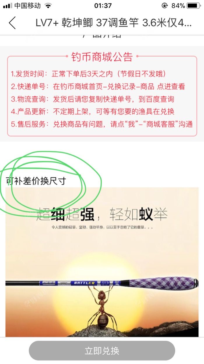 大家在钓币商城兑换鱼竿时,有没有注意到上面图片用绿色标记出来的问题?兑换时可补差价换尺寸,是补人民币还是补钓币?