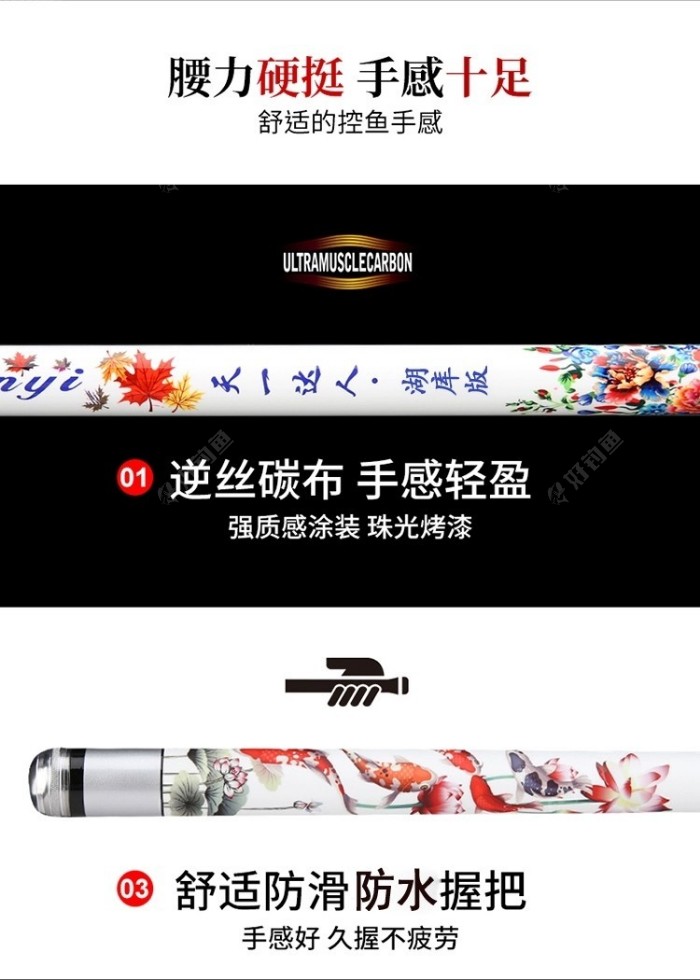 鱼竿,抄网杆,钓箱支架。 龙纹鲤三代5.7一根(沧州产),匠氏潜龙在渊5.4,7.2(两根杆稍,7.2买了下水一次,一条鱼也没钓到过,基本没怎么用过。龙纹鲤魁拔龙凤。抄网杆有点长了三米,有点瑕疵第一节...