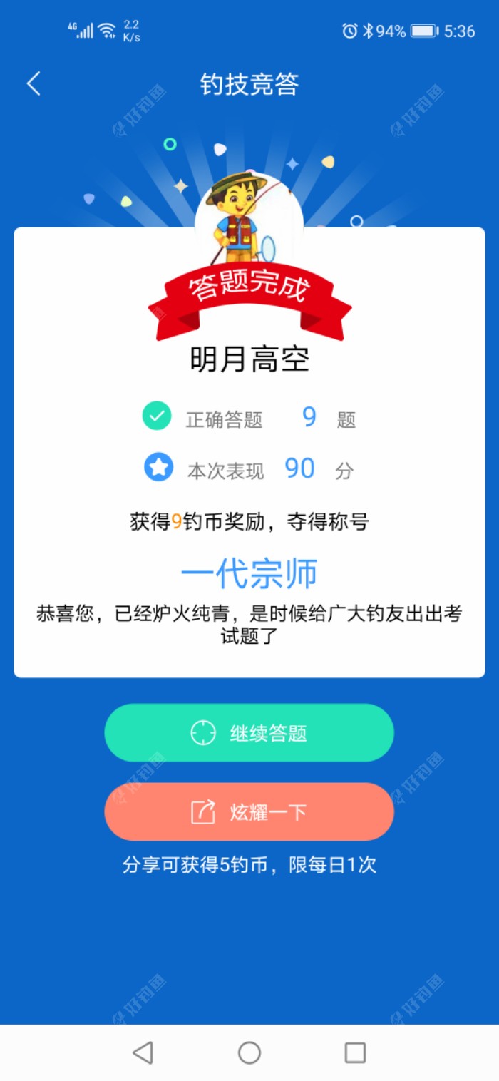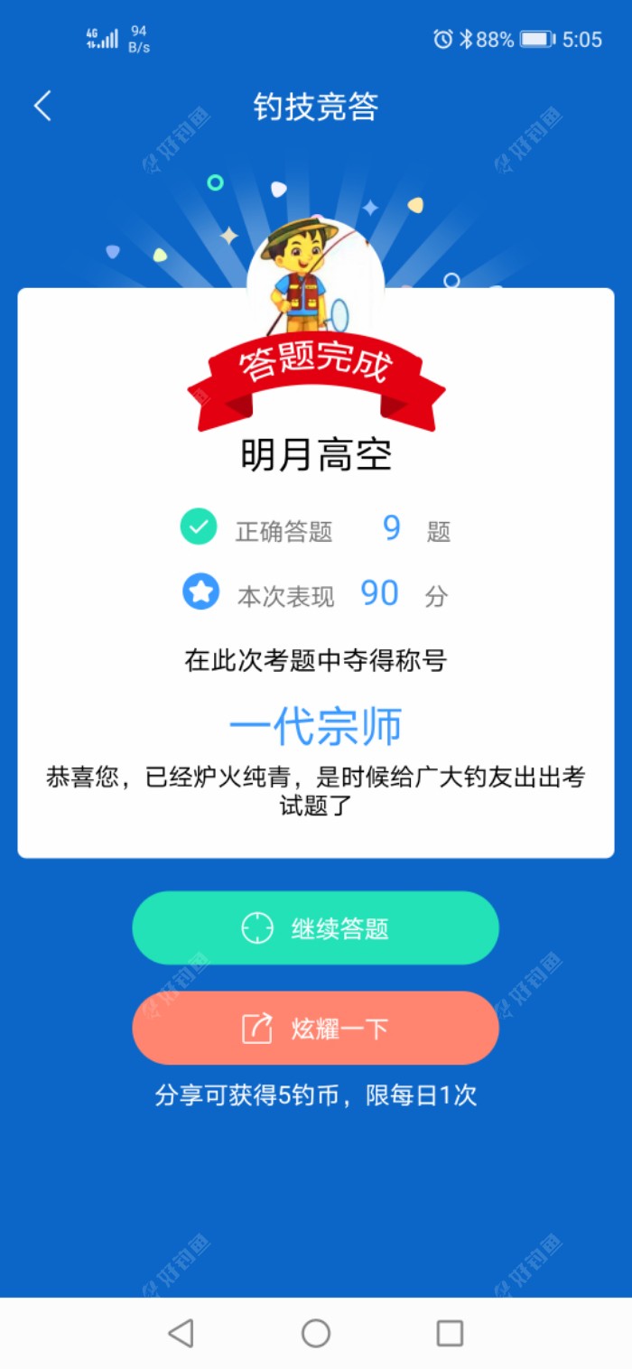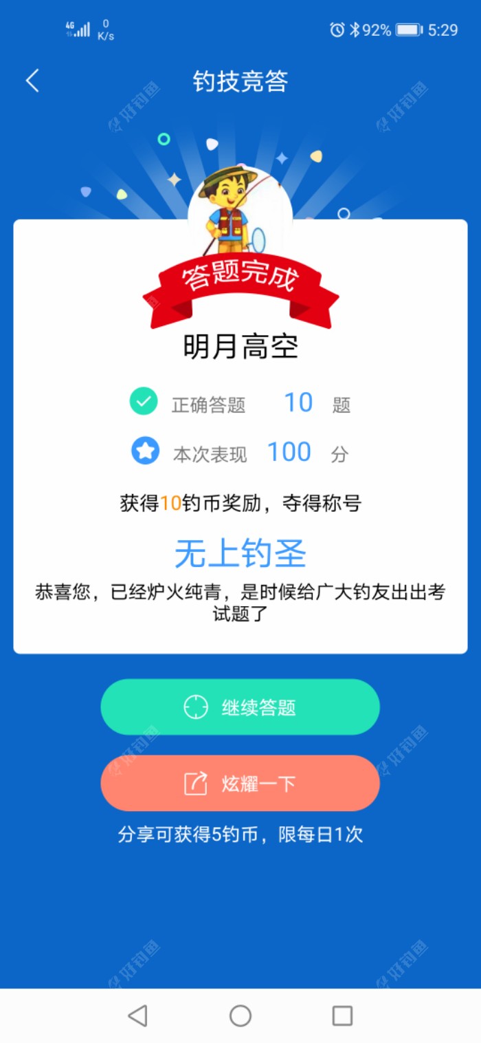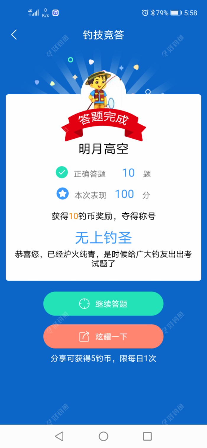 没时间去钓鱼,天天来答题,哈哈今天满分