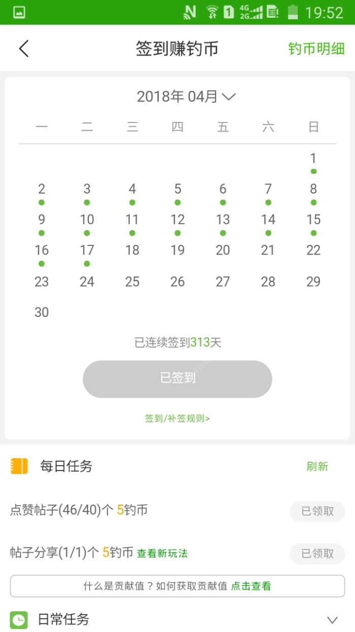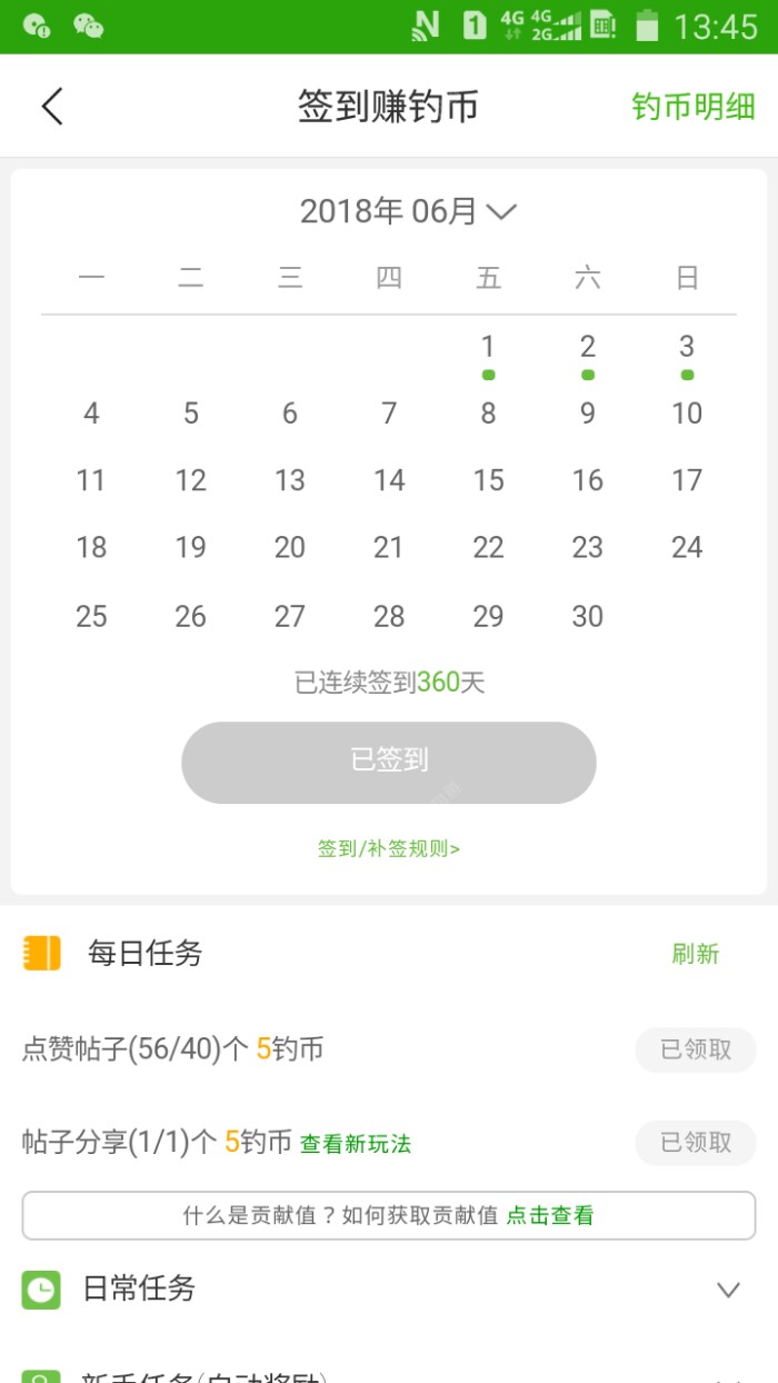 [i=s] 本帖最后由 波光浩淼 于 2018-6-3 19:01 编辑 [/i] 今天发现很多钓友都在晒签到一年的记录,我也来晒晒,好开森。??又有大把的钓币入手了,这次想换个土豪杆去耍耍。好期待。