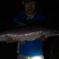 昨天晚上6点半,开始下竿,打颗粒,7点漂开始有一点下顿,我一直看着漂,直接黑票,提竿从手里面感觉上的就是青鱼,我第一时间抱竿,他开始发力,我就和他慢慢的玩,20分钟上来一看不小,30斤