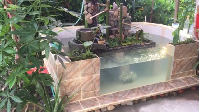 DIY鱼池假山流水。总费用298元!水泥5包。仿石砖52元一平方用2平方。10cm厚玻璃80元每平方用了0.55平方!其它材料就地取材!以后钓回来的鱼有地方养了