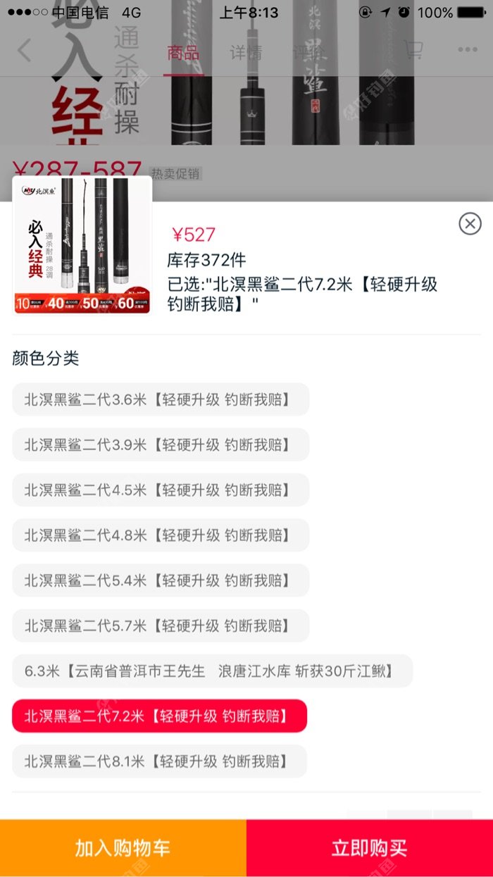 因本人想换开沃巨物鱼竿,现出售北溟鱼7.2米黑鲨,5.2本色,原价527和607,现在分别只卖400和500,只用了3次无划痕。自带第一、二、三节原装配节。要的速度,终身免费配节。想买北溟鱼的朋友抓住...